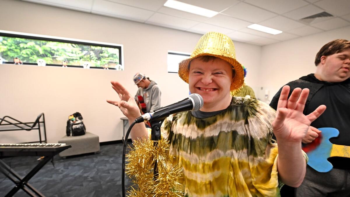 Gold standard: Ethan Finnen testing out his vocal chords on the microphone.