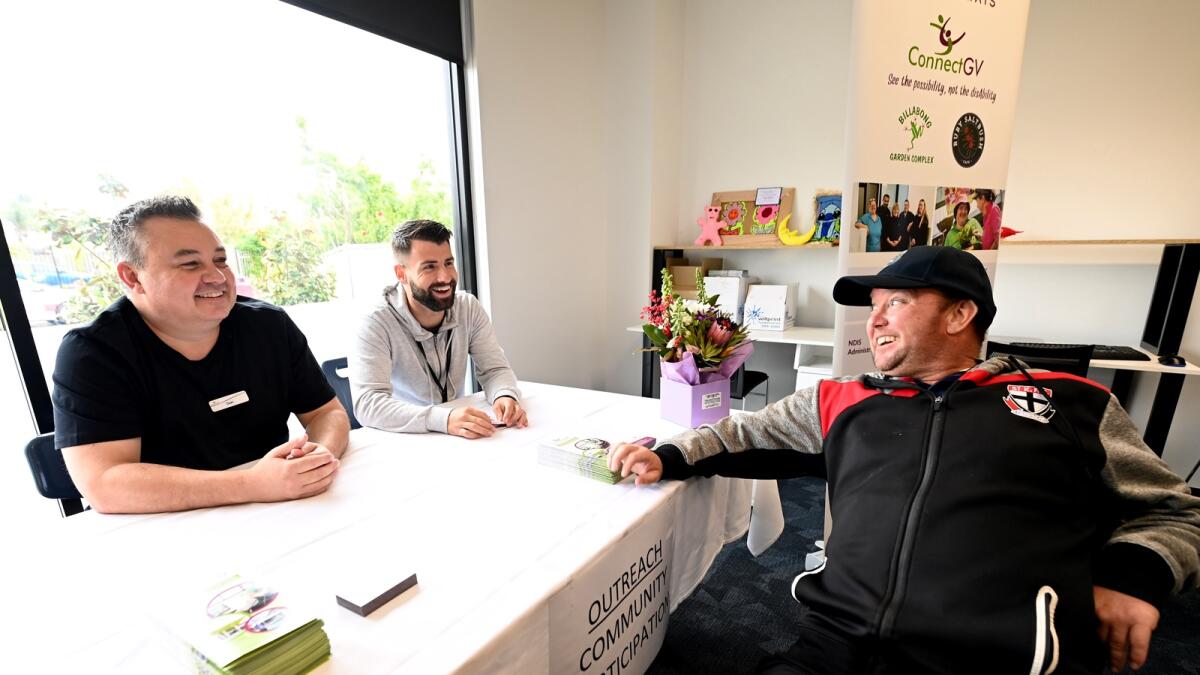Time for a chat: ConnectGV staff Daniel Falla and Sean Grant talking to Brad McGillivary about outreach community participants.