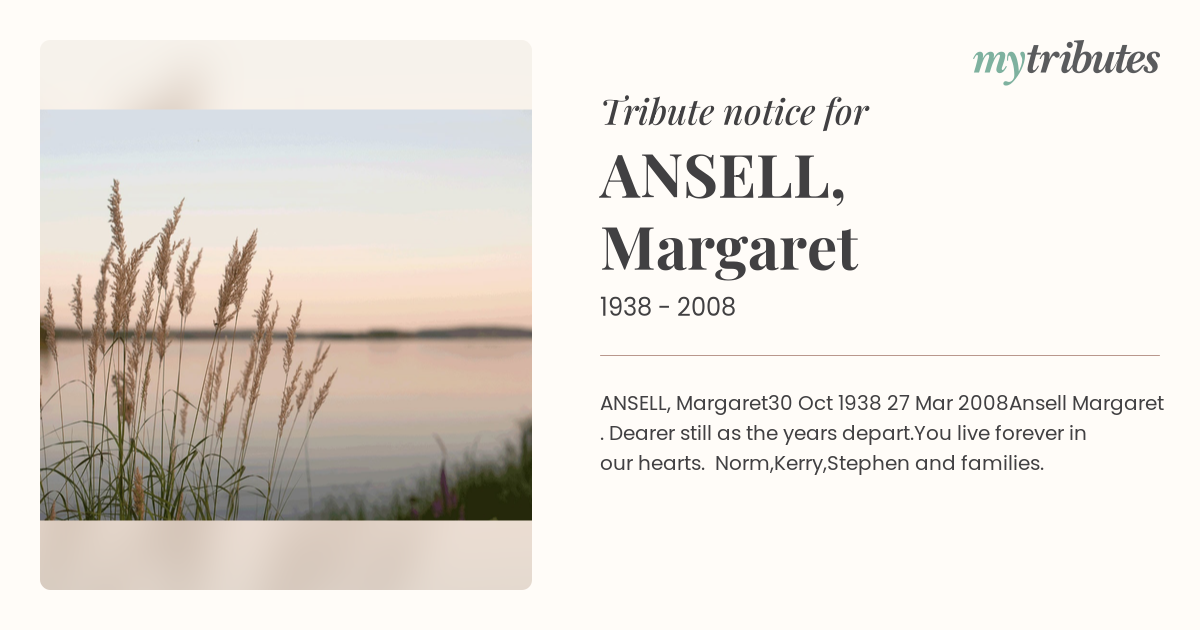 Ansell Margaret . Dearer still as the years depart.You live forever in our hearts. Norm,Kerry,Stephen and families.