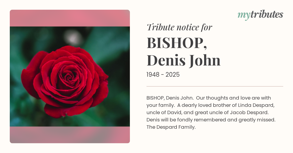 18°CBISHOP, Denis John. Our thoughts and love are with your family. A dearly loved brother of Linda Despard, uncle of David, and great uncle of Jacob Despard. Denis will be fondly remembered and greatly missed. The Despard Family.