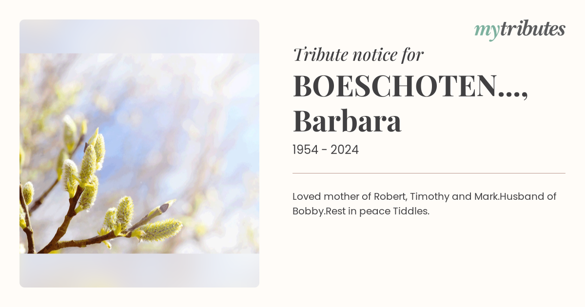 Loved mother of Robert, Timothy and Mark.Husband of Bobby.Rest in peace Tiddles.