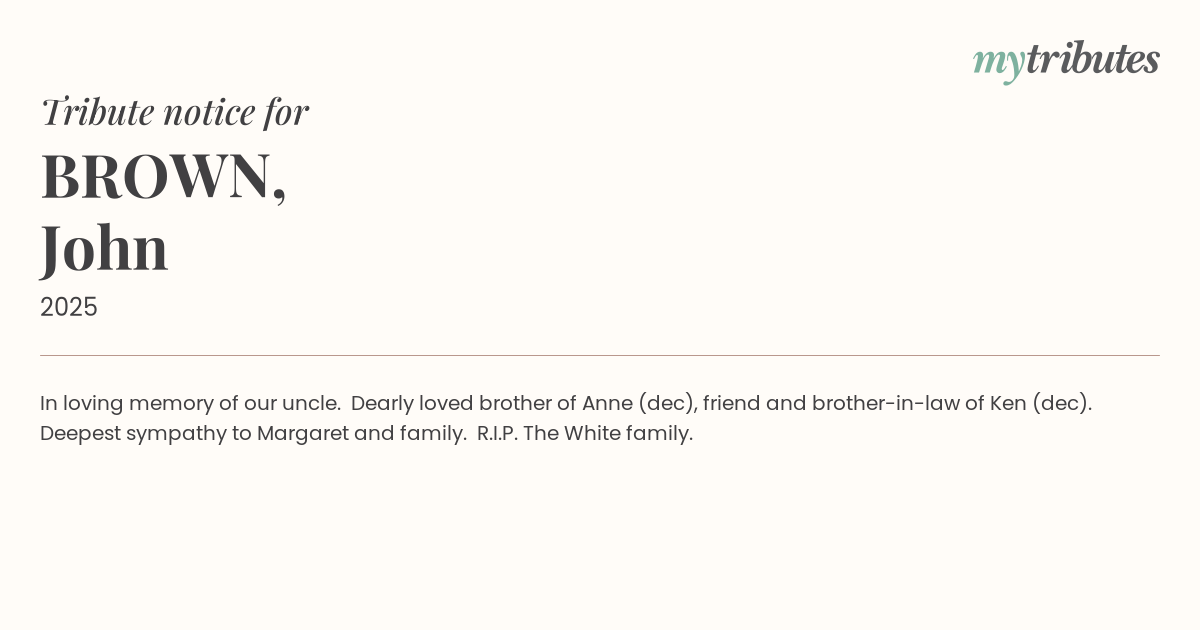 18°CIn loving memory of our uncle. Dearly loved brother of Anne (dec), friend and brother-in-law of Ken (dec). Deepest sympathy to Margaret and family. R.I.P. The White family.
