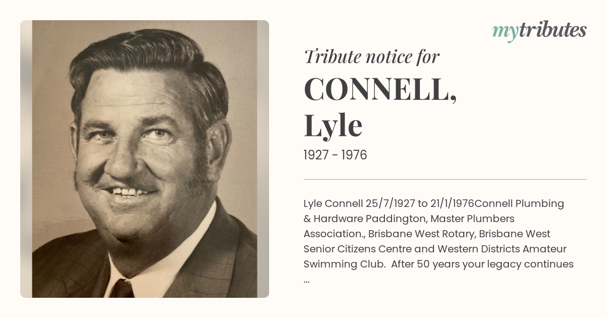 Connell Plumbing & Hardware Paddington, Master Plumbers Association., Brisbane West Rotary, Brisbane West Senior Citizens Centre and Western Districts Amateur Swimming Club. After 50 years your legacy continues and now reunited with your loving wife Beryl (3/11/2025)