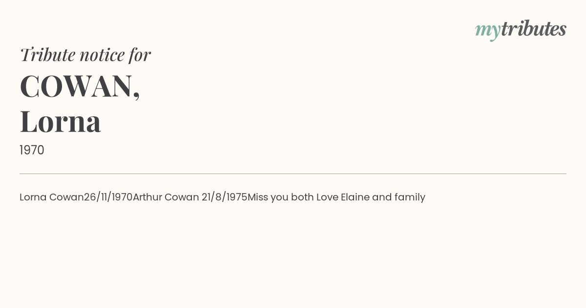 Lorna Cowan26/11/1970Arthur Cowan 21/8/1975Miss you both Love Elaine and family