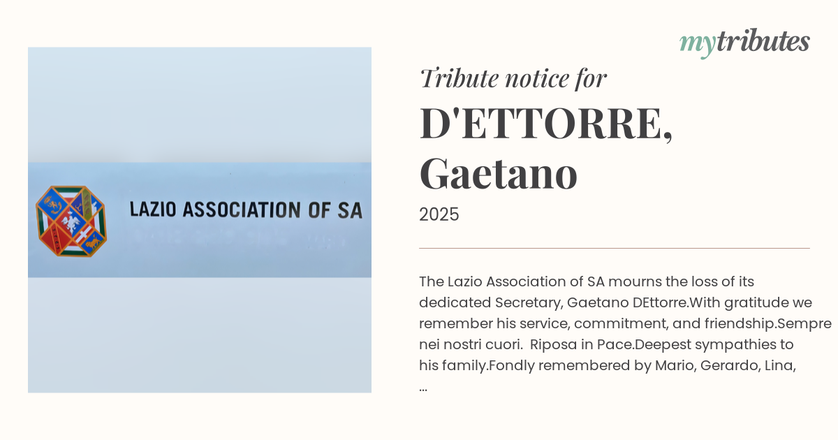 18°CThe Lazio Association of SA mourns the loss of its dedicated Secretary, Gaetano D’Ettorre.