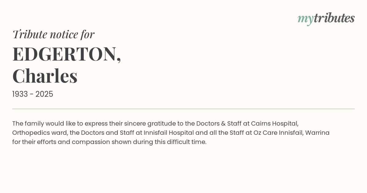 18°CThe family would like to express their sincere gratitude to the Doctors & Staff at Cairns Hospital, Orthopedics ward, the Doctors and Staff at Innisfail Hospital and all the Staff at Oz Care Innisfail, Warrina for their efforts and compassion shown during this difficult time.