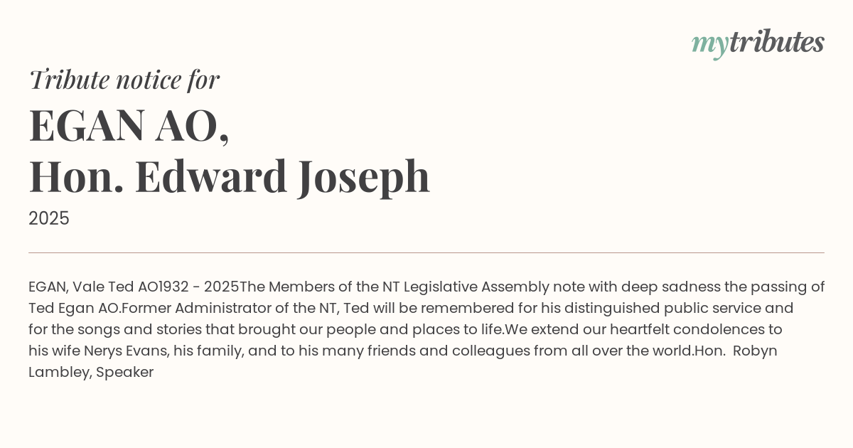 The Members of the NT Legislative Assembly note with deep sadness the passing of Ted Egan AO.