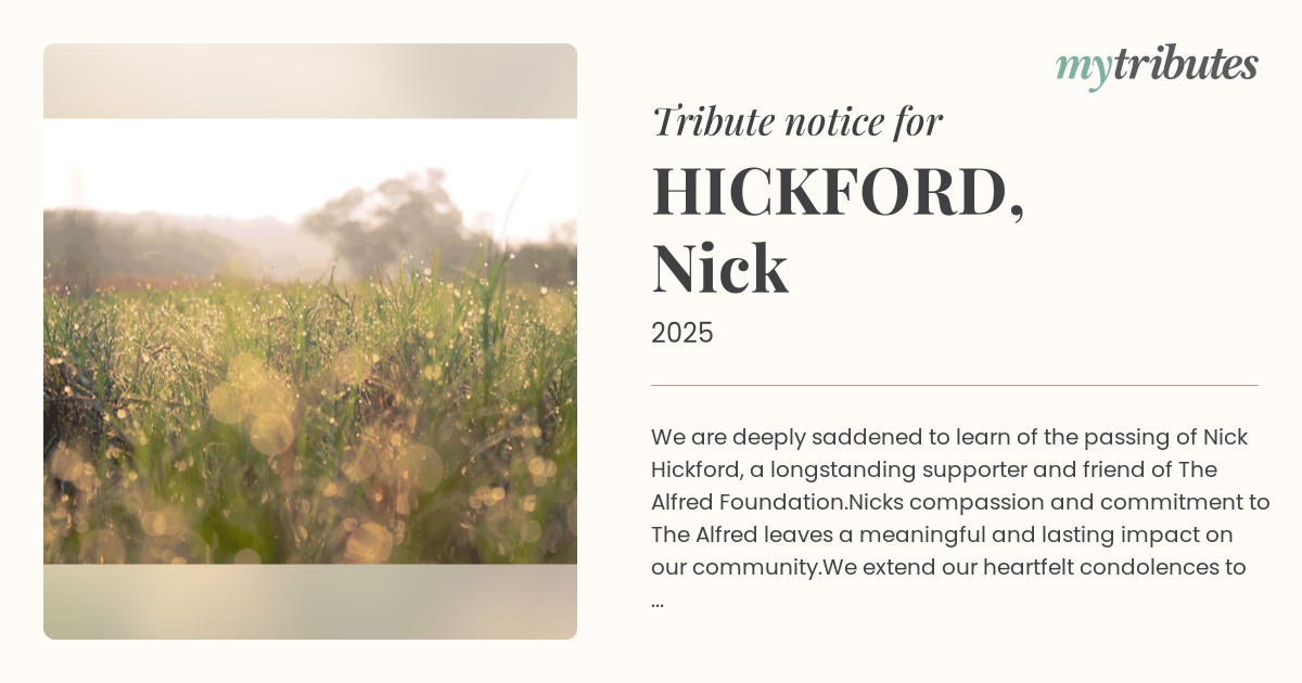18°CWe are deeply saddened to learn of the passing of Nick Hickford, a longstanding supporter and friend of The Alfred Foundation.