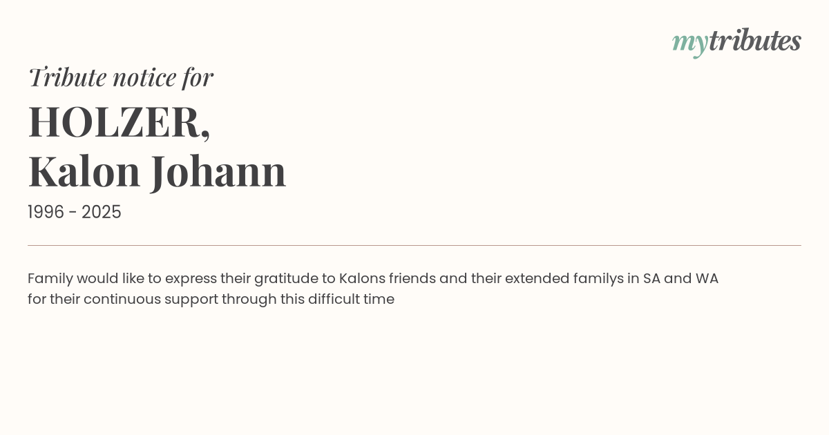 18°CFamily would like to express their gratitude to Kalon’s friends and their extended family’s in SA and WA