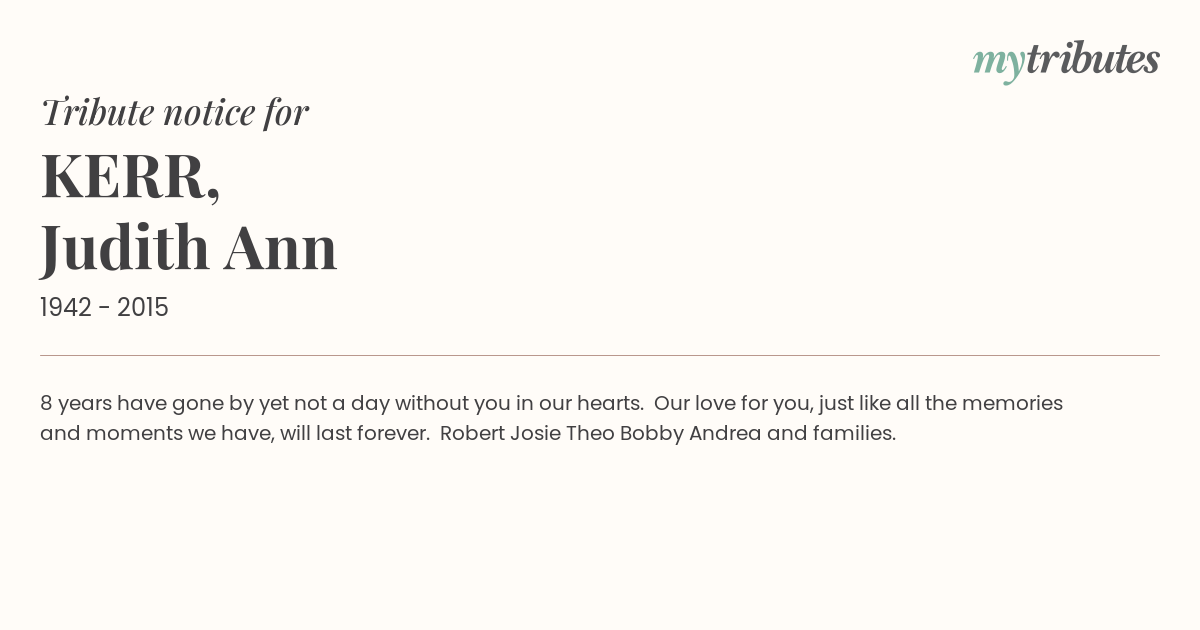 18°C8 years have gone by yet not a day without you in our hearts. Our love for you, just like all the memories and moments we have, will last forever. Robert Josie Theo Bobby Andrea and families.