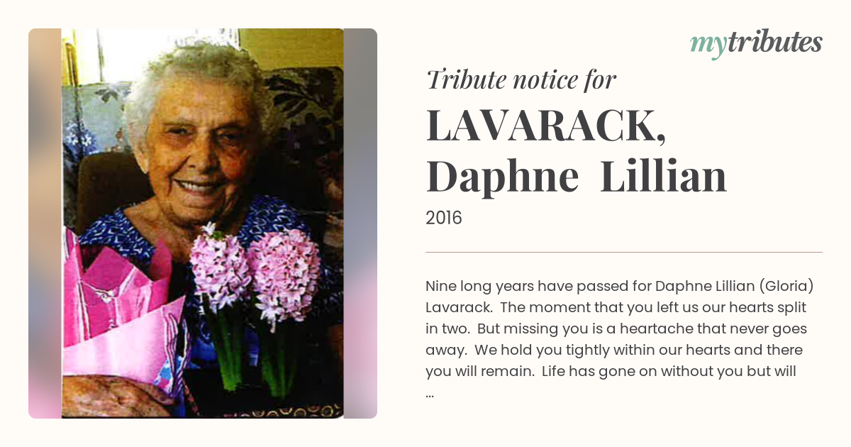 18°CNine long years have passed for Daphne Lillian (Gloria) Lavarack. The moment that you left us our hearts split in two. But missing you is a heartache that never goes away. We hold you tightly within our hearts and there you will remain. Life has gone on without you but will never be the same. Love you always, Husband Gordon, Daughter Marilyn and Son Dale and all our families.