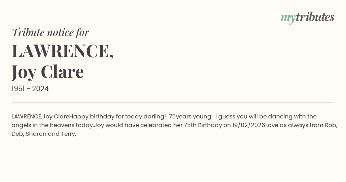Joy would have celebrated her 75th Birthday on 19/02/2026