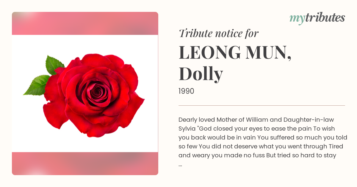 LEONG MUN, Dolly. In loving memory of our Mother, Mother-in-law and Por Por, who was called to be with our Lord on 7th December, 1990. "Forever in our hearts"