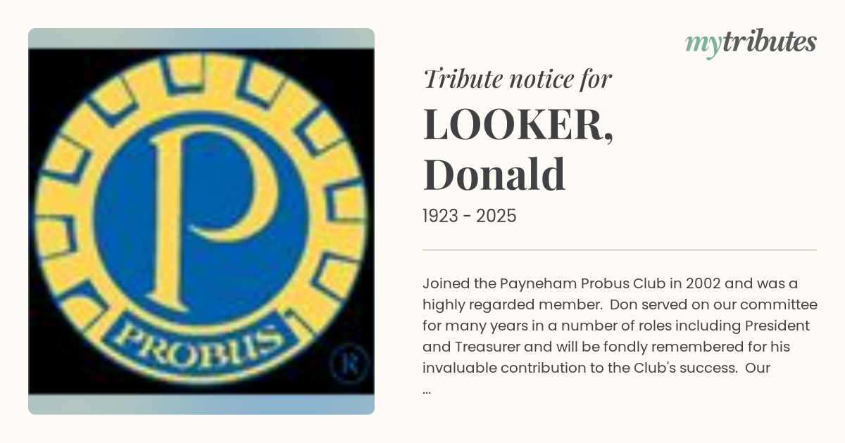 18°CJoined the Payneham Probus Club in 2002 and was a highly regarded member. Don served on our committee for many years in a number of roles including President and Treasurer and will be fondly remembered for his invaluable contribution to the Club's success.