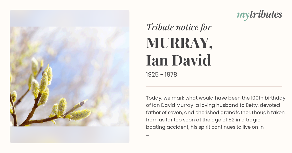 18°CToday, we mark what would have been the 100th birthday of Ian David Murray — a loving husband to Betty, devoted father of seven, and cherished grandfather.