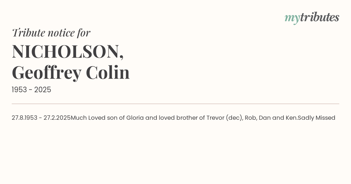 Much Loved son of Gloria and loved brother of Trevor (dec), Rob, Dan and Ken.