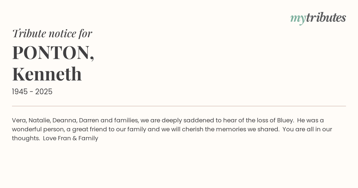 18°CVera, Natalie, Deanna, Darren and families, we are deeply saddened to hear of the loss of Bluey. He was a wonderful person, a great friend to our family and we will cherish the memories we shared. You are all in our thoughts. Love Fran & Family