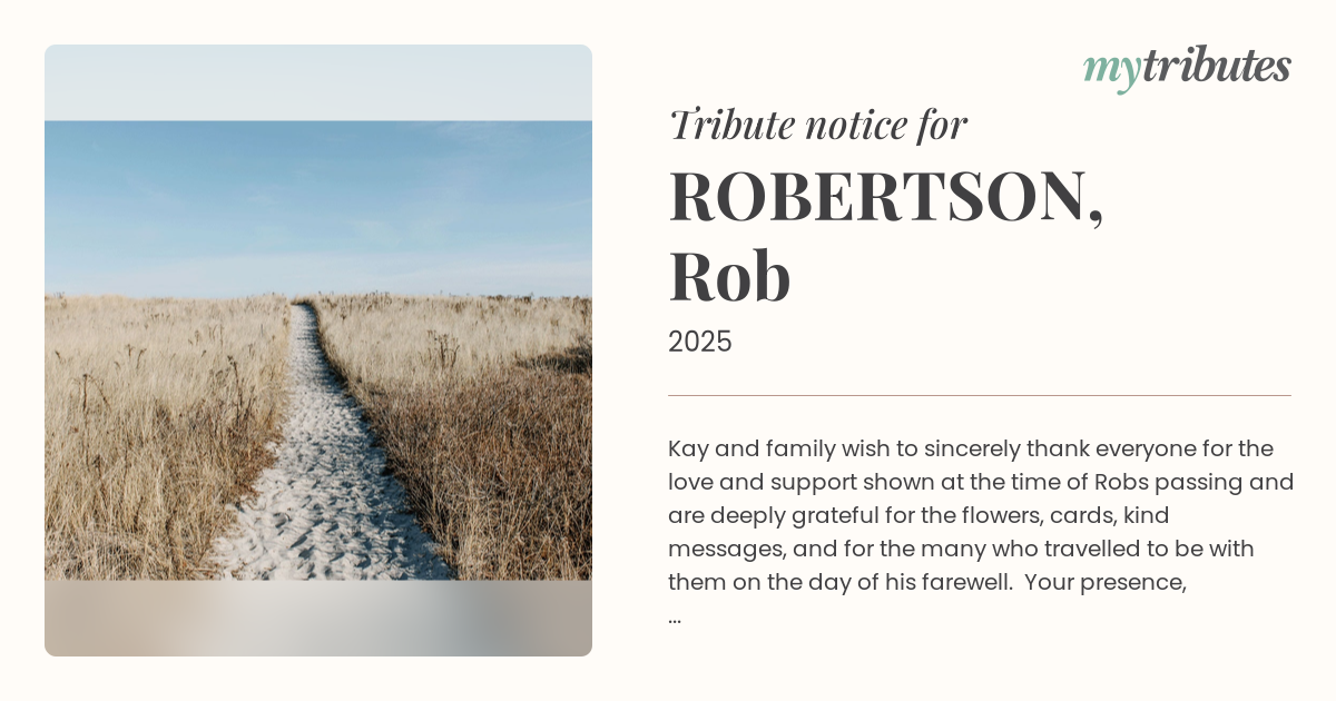 18°CKay and family wish to sincerely thank everyone for the love and support shown at the time of Rob’s passing and are deeply grateful for the flowers, cards, kind messages, and for the many who travelled to be with them on the day of his farewell. Your presence, compassion, and thoughtful gestures have brought them great comfort and strength.