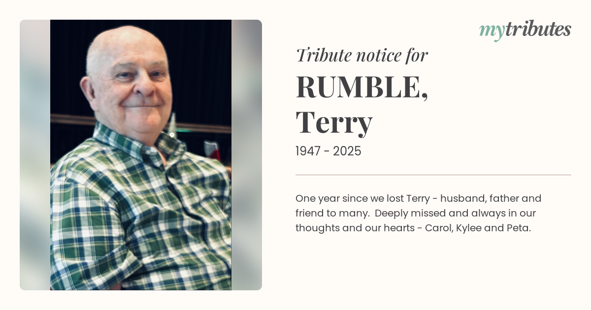 18°COne year since we lost Terry - husband, father and friend to many. Deeply missed and always in our thoughts and our hearts - Carol, Kylee and Peta.