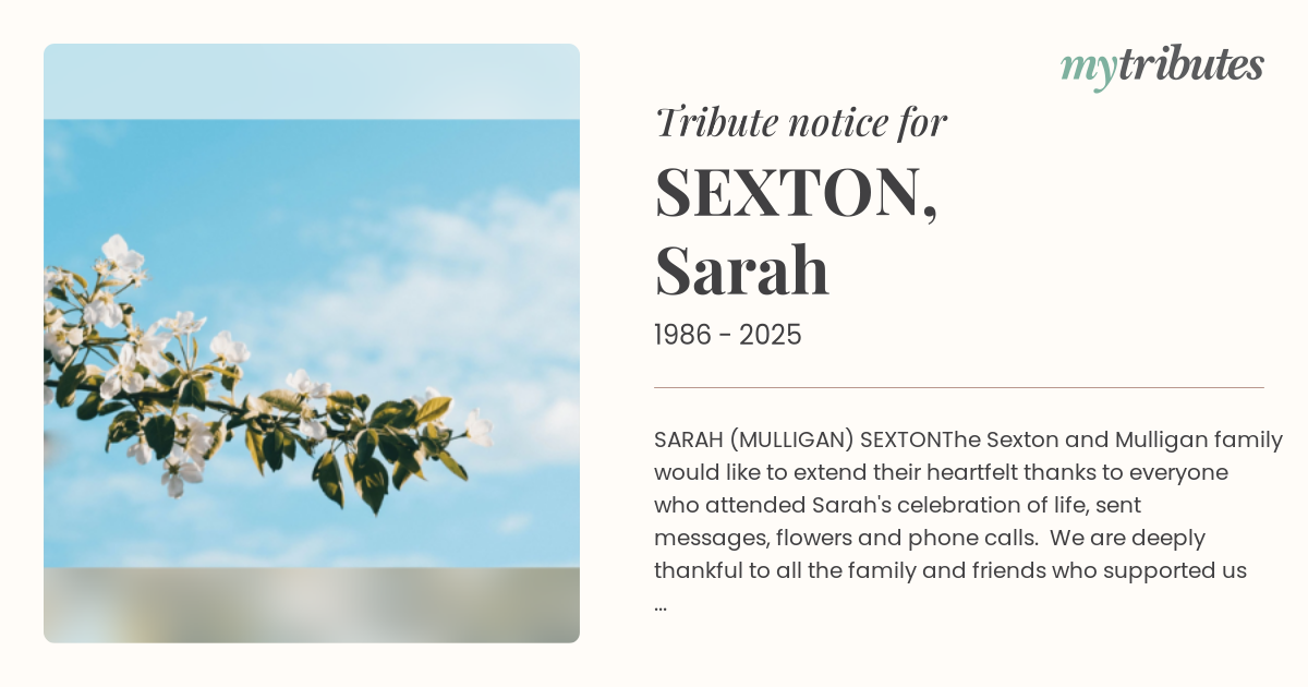 The Sexton and Mulligan family would like to extend their heartfelt thanks to everyone who attended Sarah's celebration of life, sent messages, flowers and phone calls. We are deeply thankful to all the family and friends who supported us in every possible way during this difficult time. A special thanks to the medical staff and Qld Ambulance for their unwavering support and kindness.