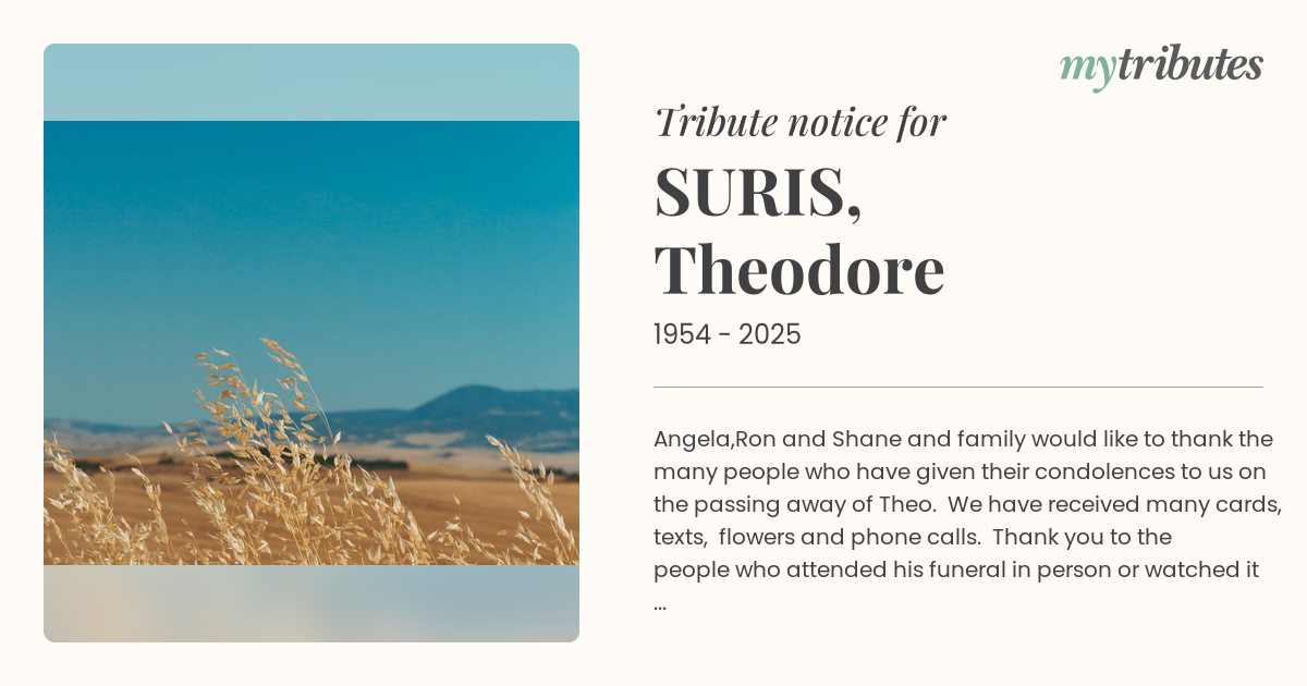 18°CAngela,Ron and Shane and family would like to thank the many people who have given their condolences to us on the passing away of Theo. We have received many cards, texts, flowers and phone calls. Thank you to the people who attended his funeral in person or watched it via the streaming service. It has bought the family much comfort to know that Theo touched so many of you. Thank you.