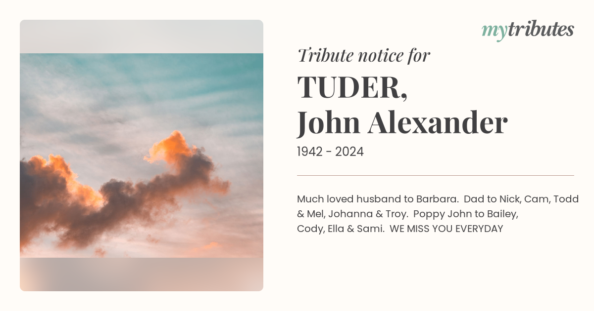 18°CMuch loved husband to Barbara. Dad to Nick, Cam, Todd & Mel, Johanna & Troy. Poppy John to Bailey, Cody, Ella & Sami.
