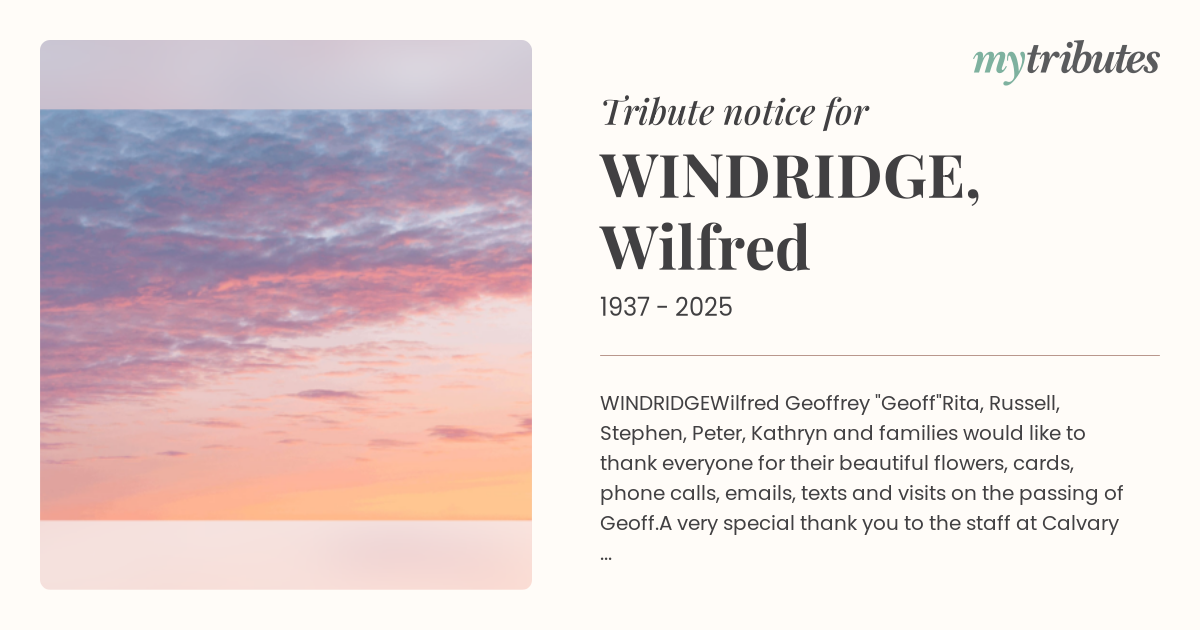 Rita, Russell, Stephen, Peter, Kathryn and families would like to thank everyone for their beautiful flowers, cards, phone calls, emails, texts and visits on the passing of Geoff.