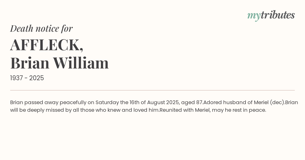 18°CBrian passed away peacefully on Saturday the 16th of August 2025, aged 87.