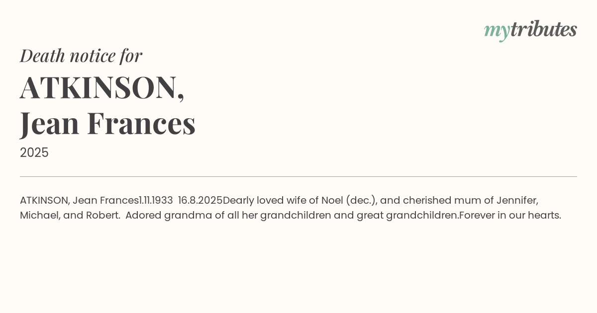 Dearly loved wife of Noel (dec.), and cherished mum of Jennifer, Michael, and Robert. Adored grandma of all her grandchildren and great grandchildren.