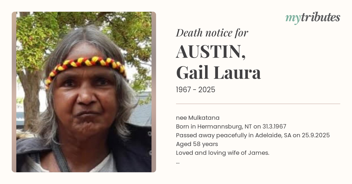 18°Cnee Mulkatana Born in Hermannsburg, NT on 31.3.1967 Passed away peacefully in Adelaide, SA on 25.9.2025 Aged 58 years Loved and loving wife of James. Cherished mother of James, Glenys, Nerida, Alvin, Hubert, Pearl and Annie. Treasured grandmother, aunty, sister and friend. So Dearly Loved, So Sadly Missed.