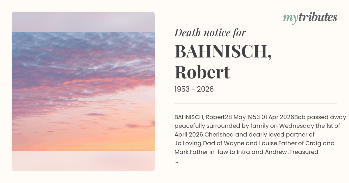 Bob passed away peacefully surrounded by family on Wednesday the 1st of April 2026.