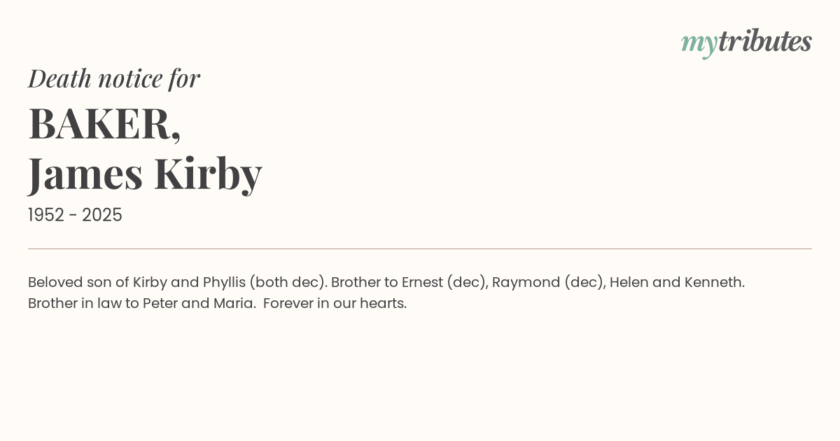 18°CBeloved son of Kirby and Phyllis (both dec). Brother to Ernest (dec), Raymond (dec), Helen and Kenneth. Brother in law to Peter and Maria.