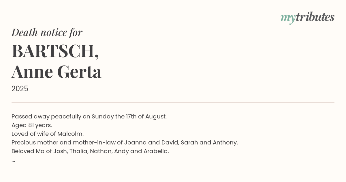18°CPassed away peacefully on Sunday the 17th of August. Aged 81 years. Loved of wife of Malcolm. Precious mother and mother-in-law of Joanna and David, Sarah and Anthony. Beloved Ma of Josh, Thalia, Nathan, Andy and Arabella. In God’s Care. Please refer to future editions of the Advertiser or Funeral Notice.