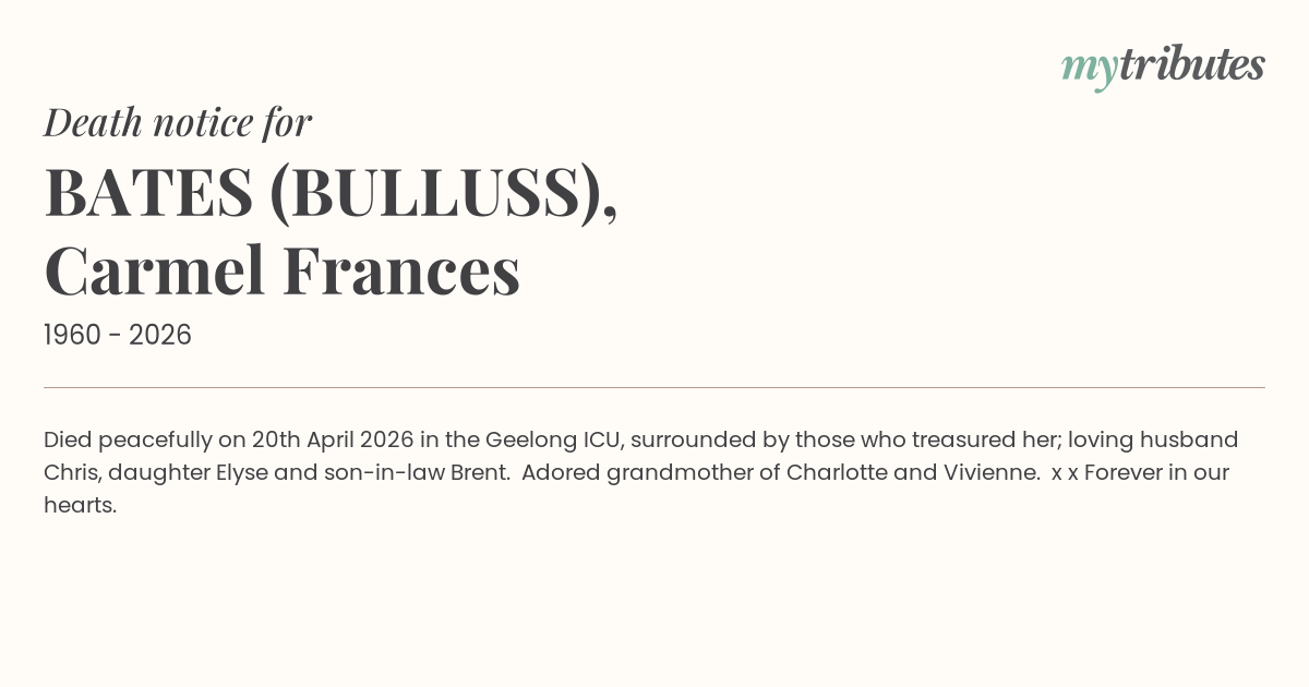 18°CDied peacefully on 20th April 2026 in the Geelong ICU, surrounded by those who treasured her; loving husband Chris, daughter Elyse and son-in-law Brent. Adored grandmother of Charlotte and Vivienne. x x