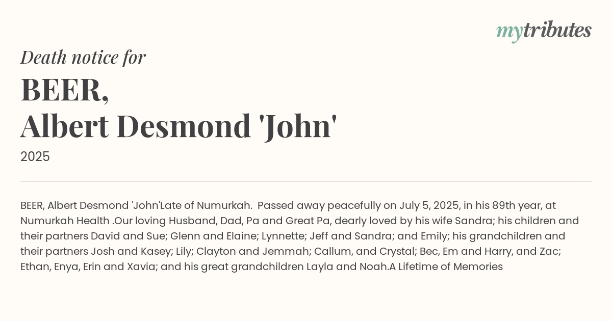 Late of Numurkah. Passed away peacefully on July 5, 2025, in his 89th year, at Numurkah Health .