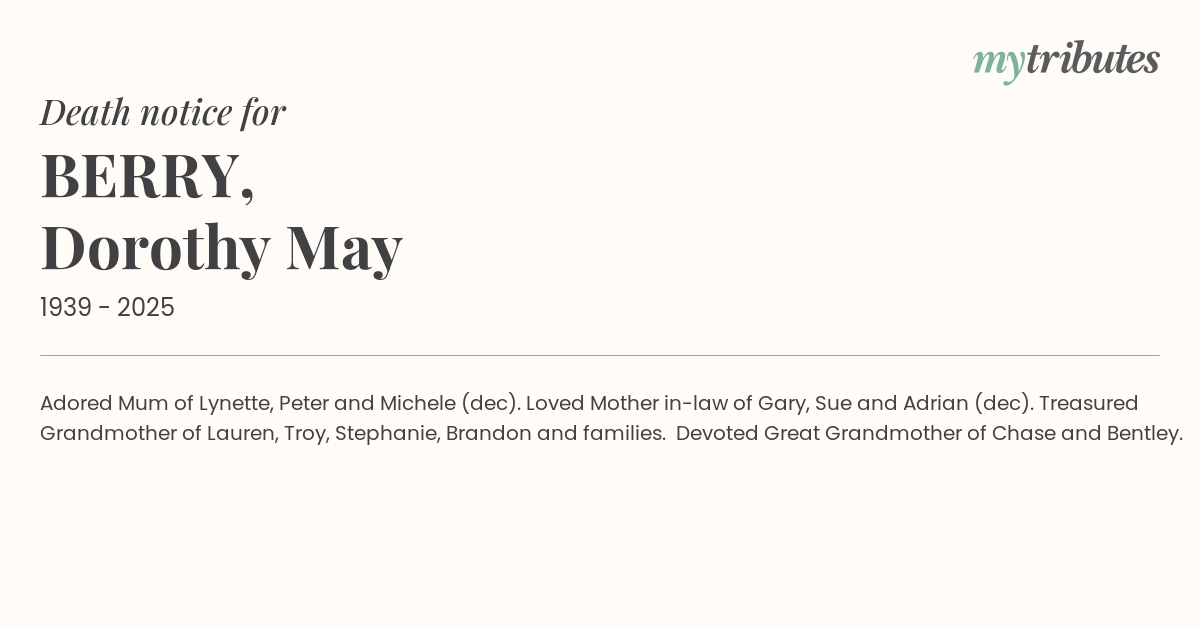 18°CAdored Mum of Lynette, Peter and Michele (dec). Loved Mother in-law of Gary, Sue and Adrian (dec). Treasured Grandmother of Lauren, Troy, Stephanie, Brandon and families. Devoted Great Grandmother of Chase and Bentley.