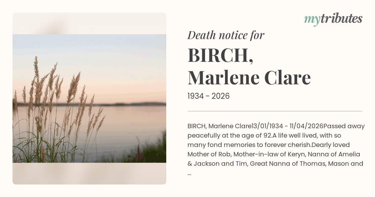 Dearly loved Mother of Rob, Mother-in-law of Keryn, Nanna of Amelia & Jackson and Tim, Great Nanna of Thomas, Mason and Ivy. XX