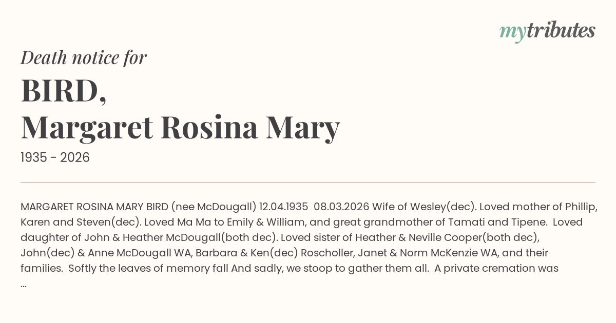 A private cremation was held for Margaret A memorial service will be held on Saturday 21st March 2026 at 10.30am at the Midlands Golf Club 330 Heinz Lane, Invermay Park.