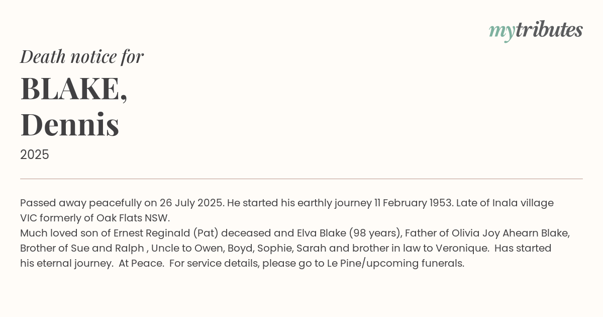Much loved son of Ernest Reginald (Pat) deceased and Elva Blake (98 years), Father of Olivia Joy Ahearn Blake, Brother of Sue and Ralph , Uncle to Owen, Boyd, Sophie, Sarah and brother in law to Veronique. Has started his eternal journey. At Peace. For service details, please go to Le Pine/upcoming funerals.
