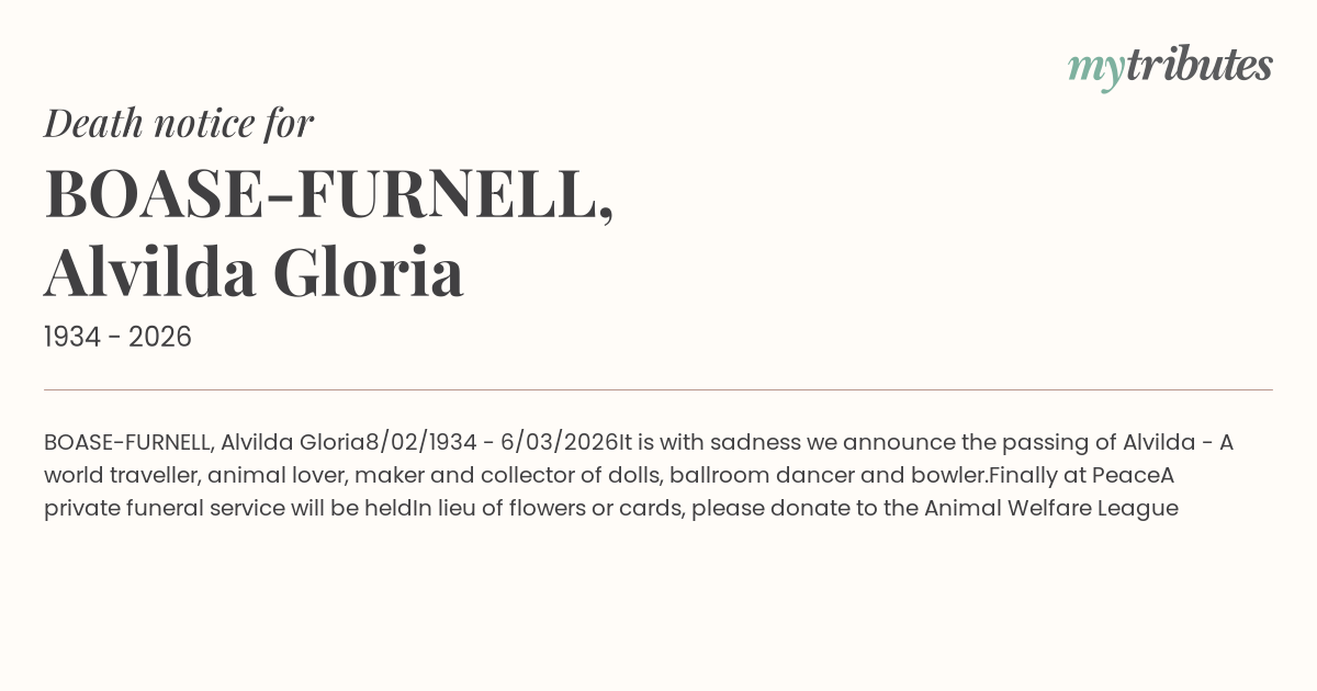 It is with sadness we announce the passing of Alvilda - A world traveller, animal lover, maker and collector of dolls, ballroom dancer and bowler.