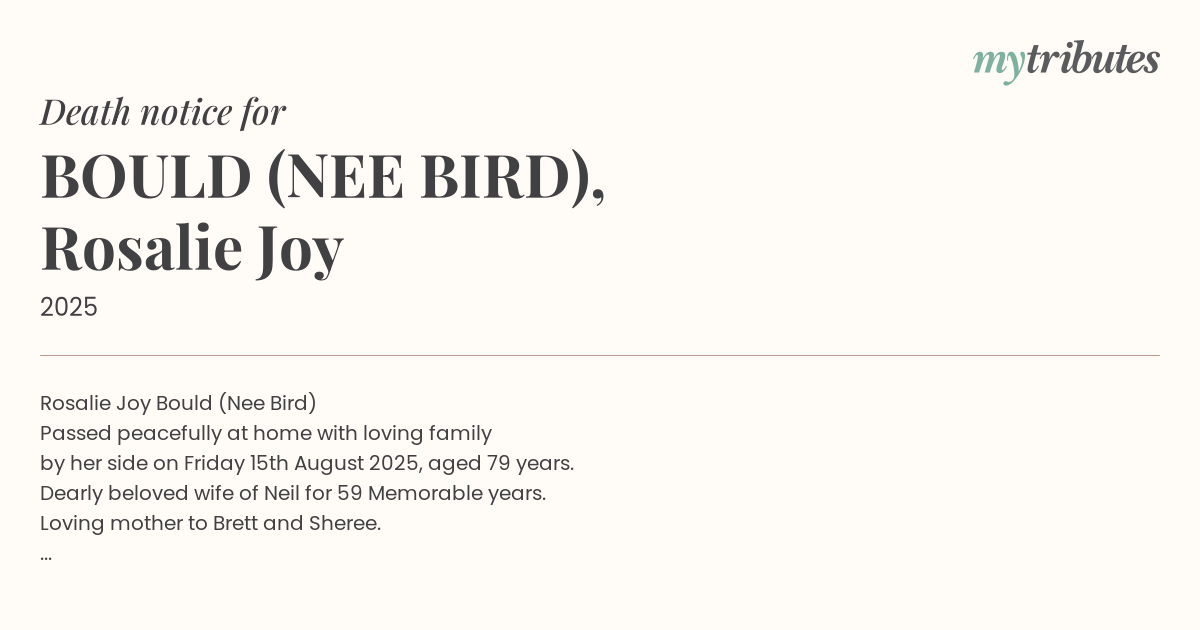 Loved Nan of Haylee, Ben and great Nan to Myles.