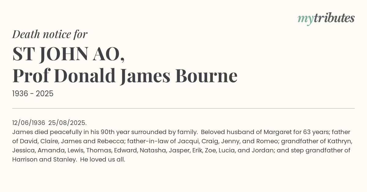 James died peacefully in his 90th year surrounded by family. Beloved husband of Margaret for 63 years; father of David, Claire, James and Rebecca; father-in-law of Jacqui, Craig, Jenny, and Romeo; grandfather of Kathryn, Jessica, Amanda, Lewis, Thomas, Edward, Natasha, Jasper, Erik, Zoe, Lucia, and Jordan; and step grandfather of Harrison and Stanley. He loved us all.