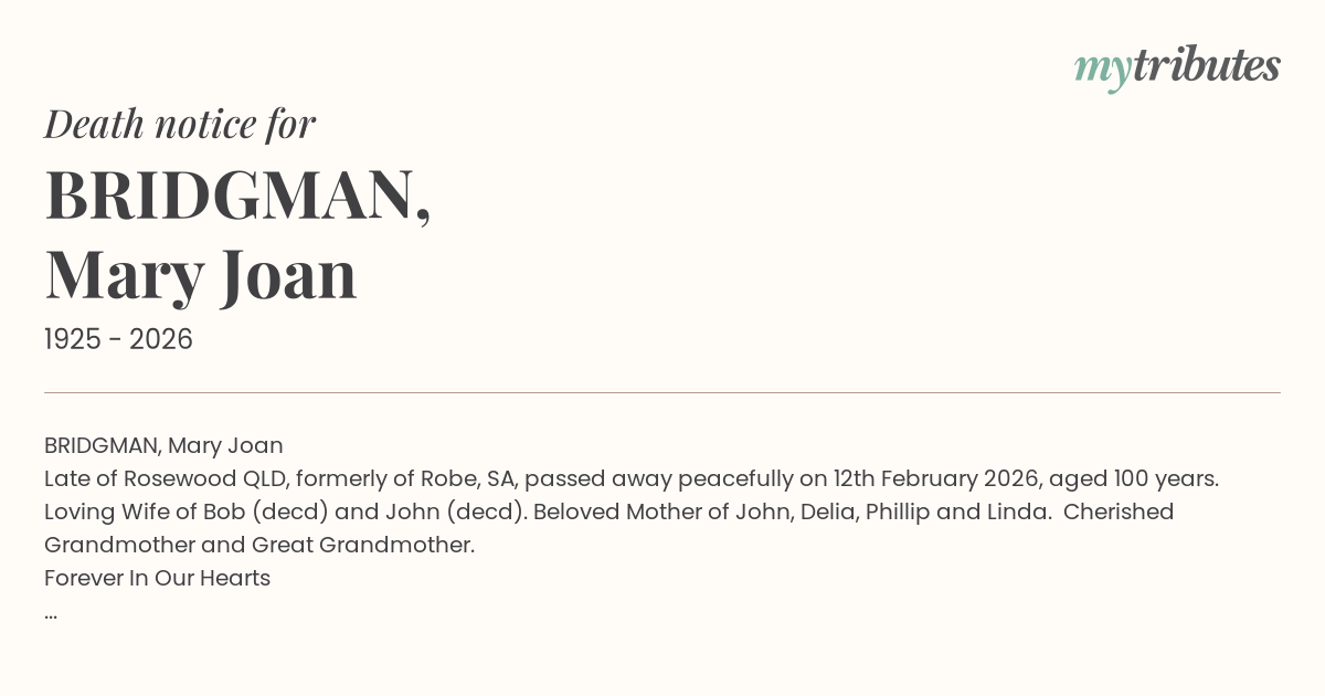 Late of Rosewood QLD, formerly of Robe, SA, passed away peacefully on 12th February 2026, aged 100 years.