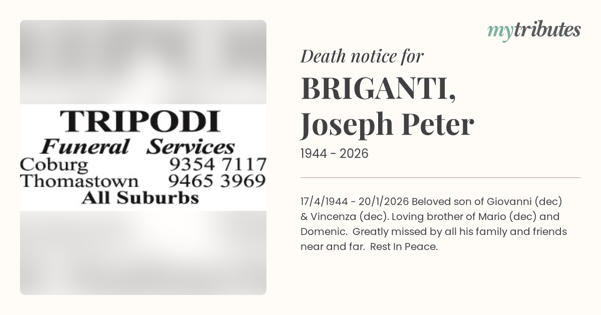 18°C17/4/1944 - 20/1/2026 Beloved son of Giovanni (dec) & Vincenza (dec). Loving brother of Mario (dec) and Domenic. Greatly missed by all his family and friends near and far. Rest In Peace.