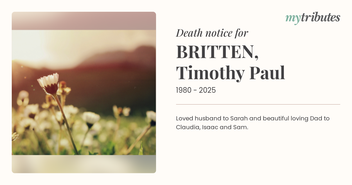 Loved husband to Sarah and beautiful loving Dad to Claudia, Isaac and Sam.