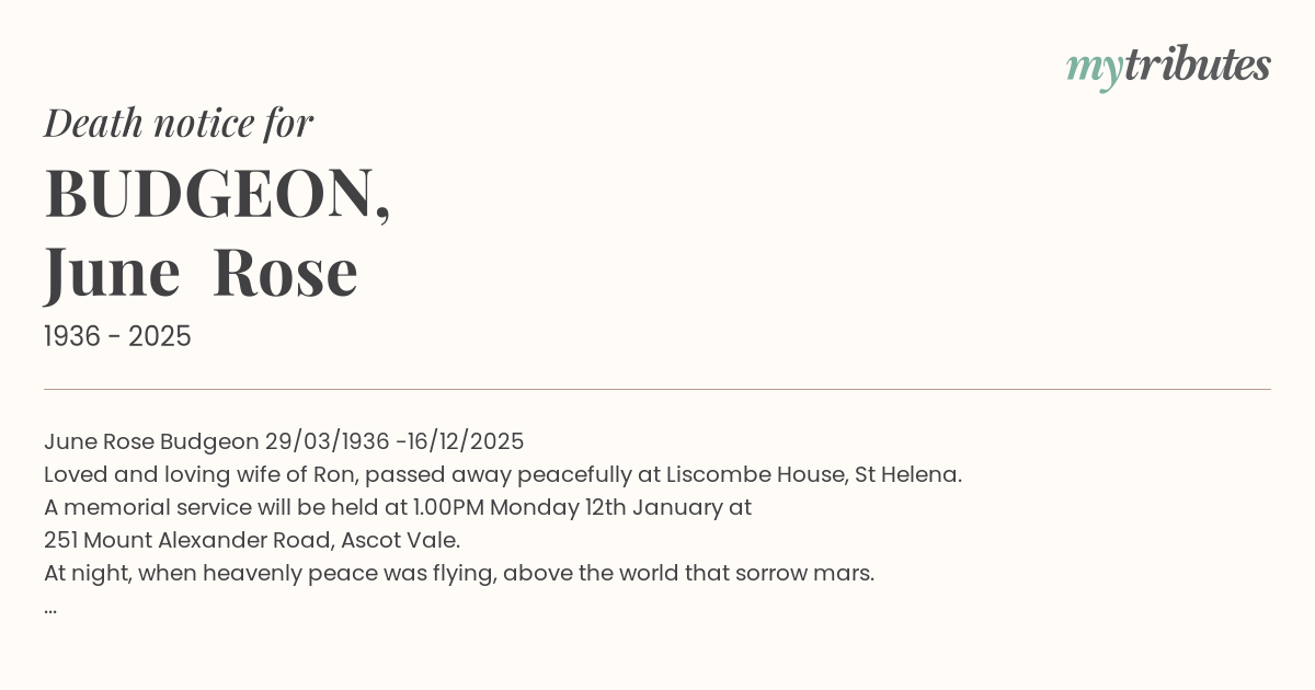 18°CJune Rose Budgeon 29/03/1936 -16/12/2025