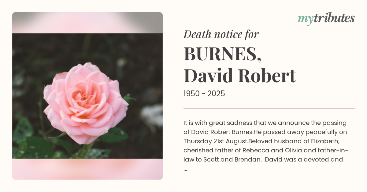 18°CIt is with great sadness that we announce the passing of David Robert Burnes.