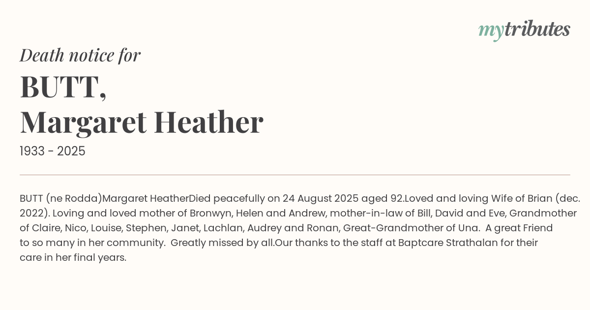 Loved and loving Wife of Brian (dec. 2022). Loving and loved mother of Bronwyn, Helen and Andrew, mother-in-law of Bill, David and Eve, Grandmother of Claire, Nico, Louise, Stephen, Janet, Lachlan, Audrey and Ronan, Great-Grandmother of Una. A great Friend to so many in her community.