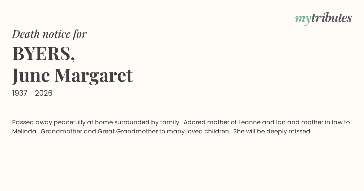 18°CPassed away peacefully at home surrounded by family. Adored mother of Leanne and Ian and mother in law to Melinda. Grandmother and Great Grandmother to many loved children. She will be deeply missed.