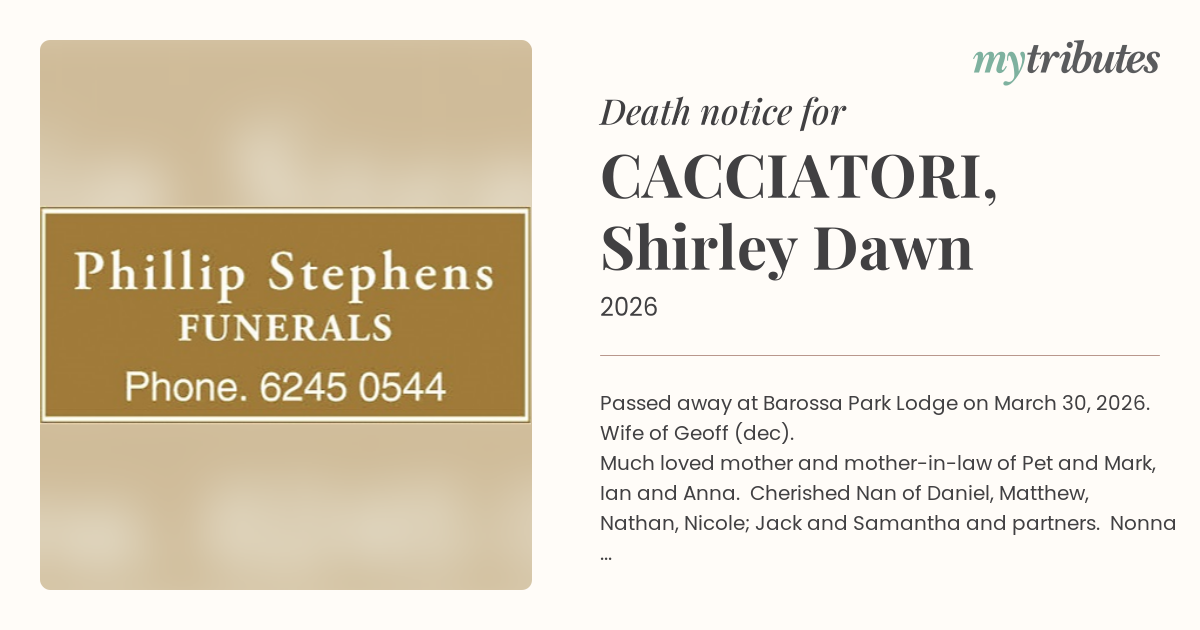 18°CPassed away at Barossa Park Lodge on March 30, 2026.